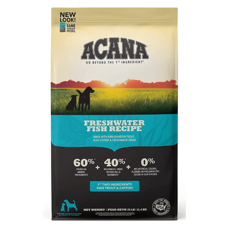 La Receta de pescado de agua dulce de ACANA está formulada para cumplir con los niveles nutricionales establecidos por los perfiles de nutrientes de alimentos para perros de la AAFCO para todas las etapas de la vida, incluido el crecimiento de perros de gran tamaño (70 lb o más en la edad adulta).