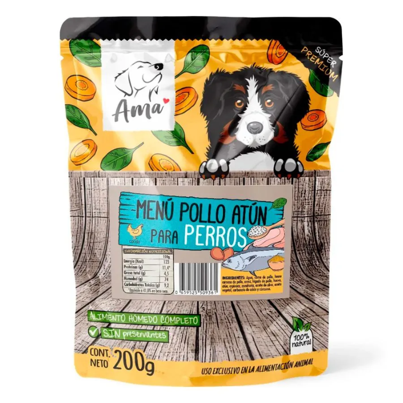 Ama Menú Pollo Atún, Alimento Húmedo Completo para Perros, sachet de 200 gr