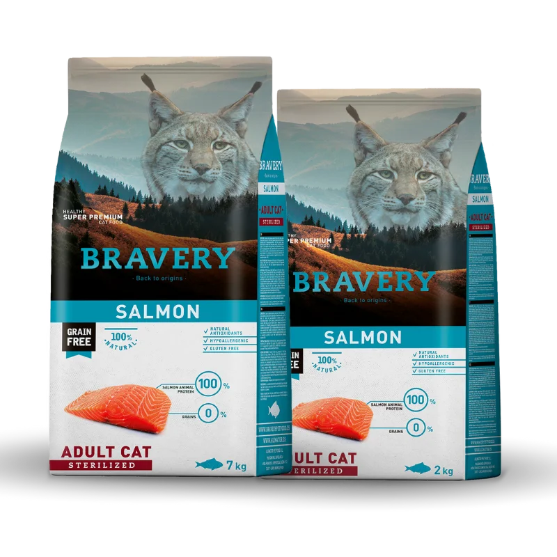 Bravery Salmon Adult Cat Sterilized, Alimento Seco para Gatos Adultos Esterilizados, Salmón , bolsa de 2 y 7 kg