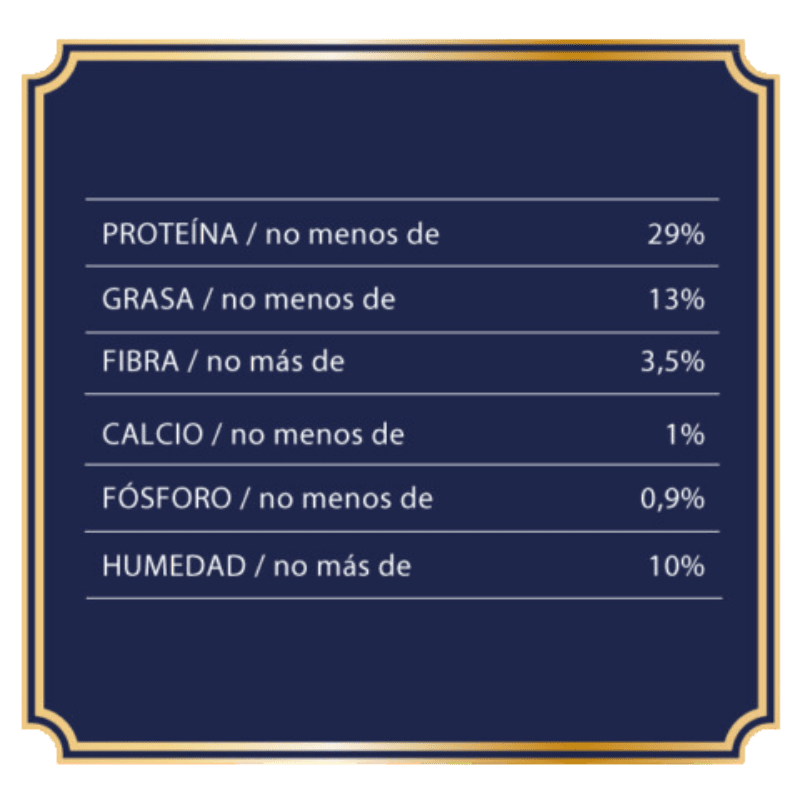 | Vitaminas & Minerales | Incluye vitaminas A, D3, E, B12, Calcio, Fósforo, Zinc, Hierro |