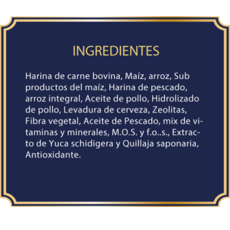 Harina de carne bovina, maíz, arroz, harina de pescado, aceite de pollo, aceite de pescado, pulpa de remolacha, levadura de cerveza, zeolitas, fibra vegetal, prebióticos M.O.S y F.O.S, extracto de yuca schidigera y quillaja saponaria, mezcla de vitaminas y minerales, antioxidantes naturales.