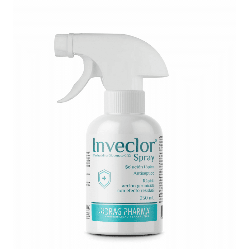 Por su acción bactericida y fungicida de amplio espectro, Inveclor® Spray se indica como antiséptico y también para el aseo pre-quirúrgico de la piel del animal. Puede ser utilizado como antiséptico de la piel previo la introducción de catéteres endovenosos, o en cualquier procedimiento quirúrgico menor que requiera una antisepsia profunda de la piel intacta. Su uso se indica como alternativa al uso de antisépticos yodados. Solución tópica Antiséptico – Rápida acción germicida con efecto residual. Composición: Cada 100 mL de solución tópica contiene: Clorhexidina Gluconato 20%……………………..2,5 g (Equivalente a 0,5 g de Clorhexidina Gluconato) Excipientes c.s.p……………………………..……..100 mL Especies de destino: Perros, gatos, caballos, bovinos, ovinos, caprinos, cerdos, aves y animales exóticos. Precauciones: Evitar el contacto con los ojos, oídos y boca. El producto puede causar lesiones permanentes por la irritación de estas áreas. Si hubiere contacto se recomienda enjuagar inmediatamente con abundante agua fría.
