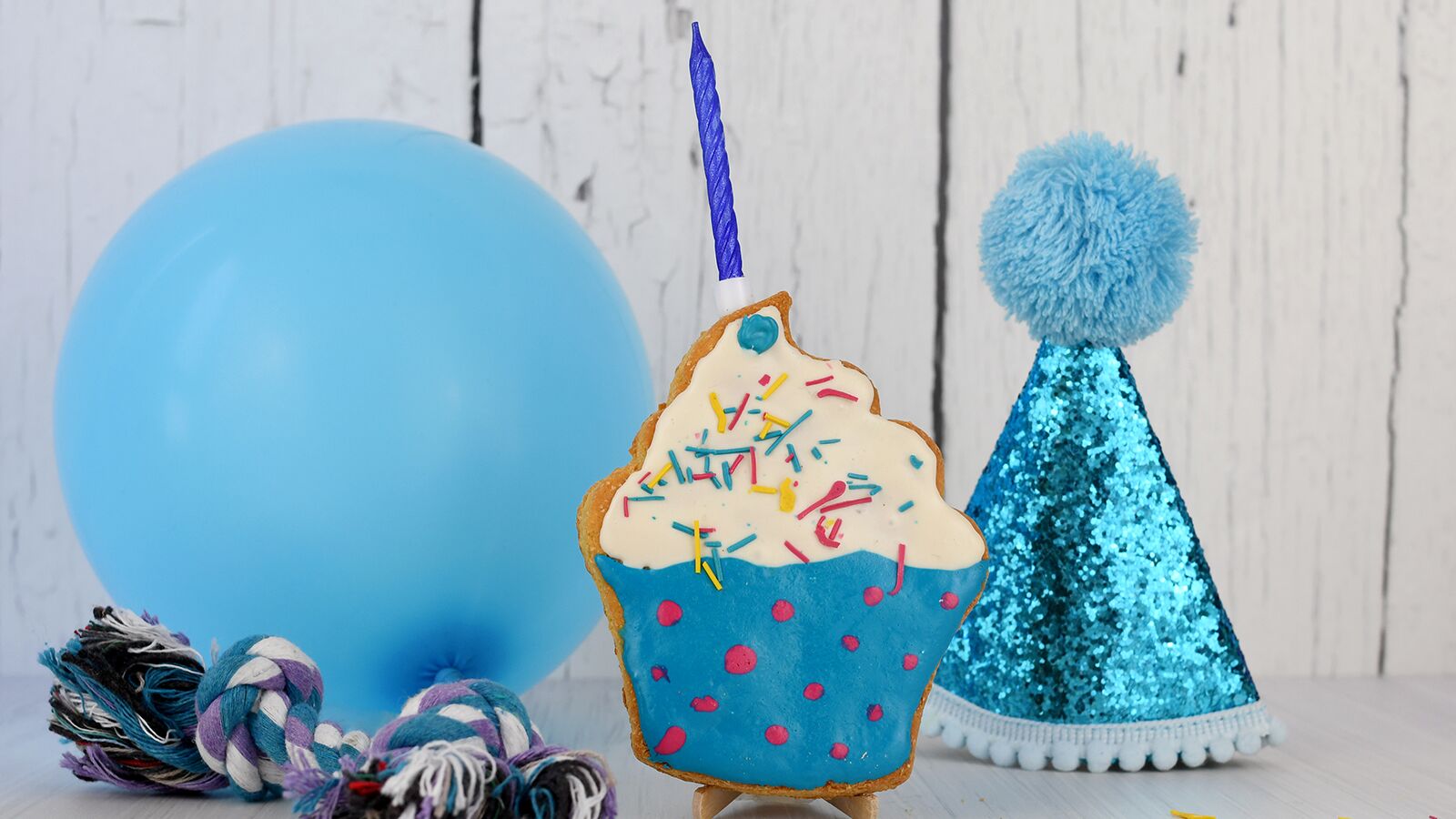 - CELESTE: Galletón diseño cupcake celeste ( gorro Escarcha Celeste + vela azul+ globo azul+ globo paws).
