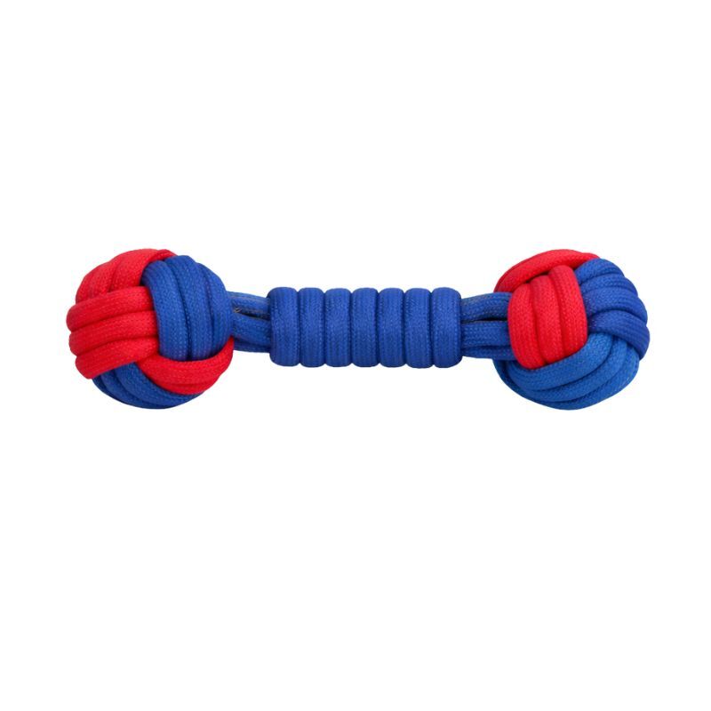 Juguete en forma de mancuerna hecho con cuerdas trenzadas resistentes, ideal para sesiones de juego activo con tu perro. Diseñado para lanzar, tirar y masticar, estimula el ejercicio físico, fortalece la mandíbula y ayuda en la limpieza dental. Las bolas de nudo en ambos extremos ofrecen una textura atractiva para morder, y su diseño ergonómico permite sujetarlo con facilidad.