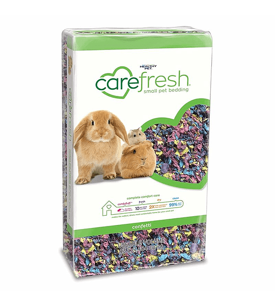 El Healthy Pet Carefresh Confetti es un sustrato premium fabricado con fibra de madera (papel) 100% sostenible y renovable, diseñado para brindar comodidad, higiene y enriquecimiento ambiental a animales pequeños como conejos, cuyes, chinchillas, hámsters, jerbos, ratones y hurones.