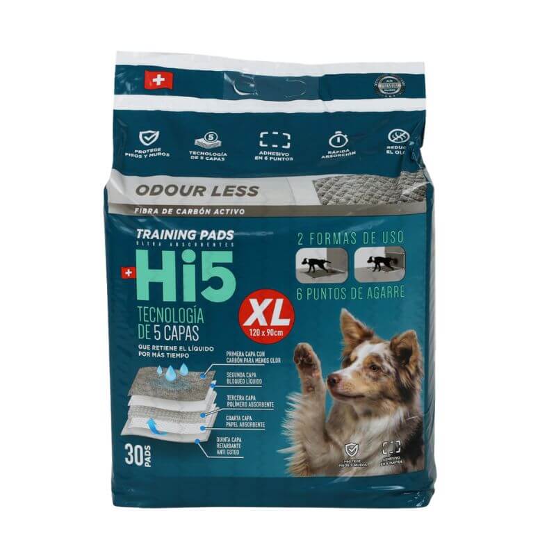 Las sabanillas Hi5 XL con carbón activo ofrecen una solución eficaz y cómoda para el entrenamiento de tu perro. Con un tamaño de 120×90 cm y una capacidad de absorción superior, están diseñadas para mantener tu hogar limpio y libre de malos olores. Gracias a su tecnología de 5 capas y su núcleo con 42 g de gel súper absorbente, cada unidad puede retener hasta 2350 ml de agua o 1950 ml de solución salina. Estas sabanillas no solo absorben, sino que también neutralizan olores y eliminan bacterias, proporcionando un entorno más higiénico para ti y tu mascota