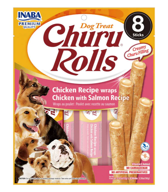 Inaba Churu Rolls, Snack para Perros, Sabores Pollo y Pollo/Salmón, 8 un, bolsa de 96 gr