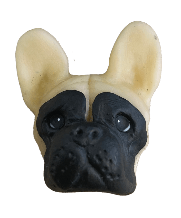 Llavero con forma de perro raza Bulldog Francés, color bayo. Dimensiones: 3 cm de diámetro aprox.