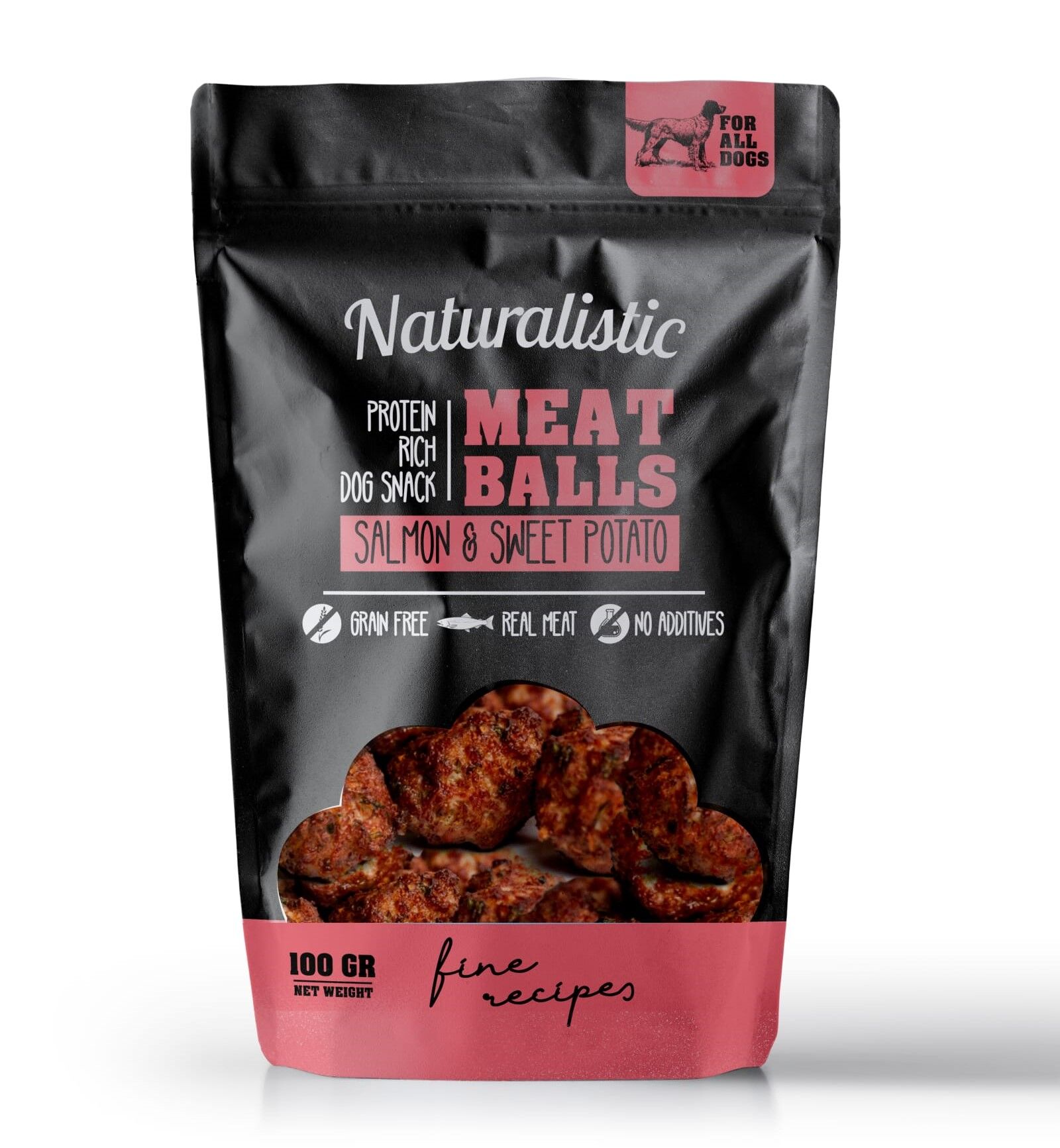 Naturalistic Meatballs Salmon and Sweet Potato, Snack para Perros, Albóndigas de Salmón y Camote, bolsa de 100 gr
