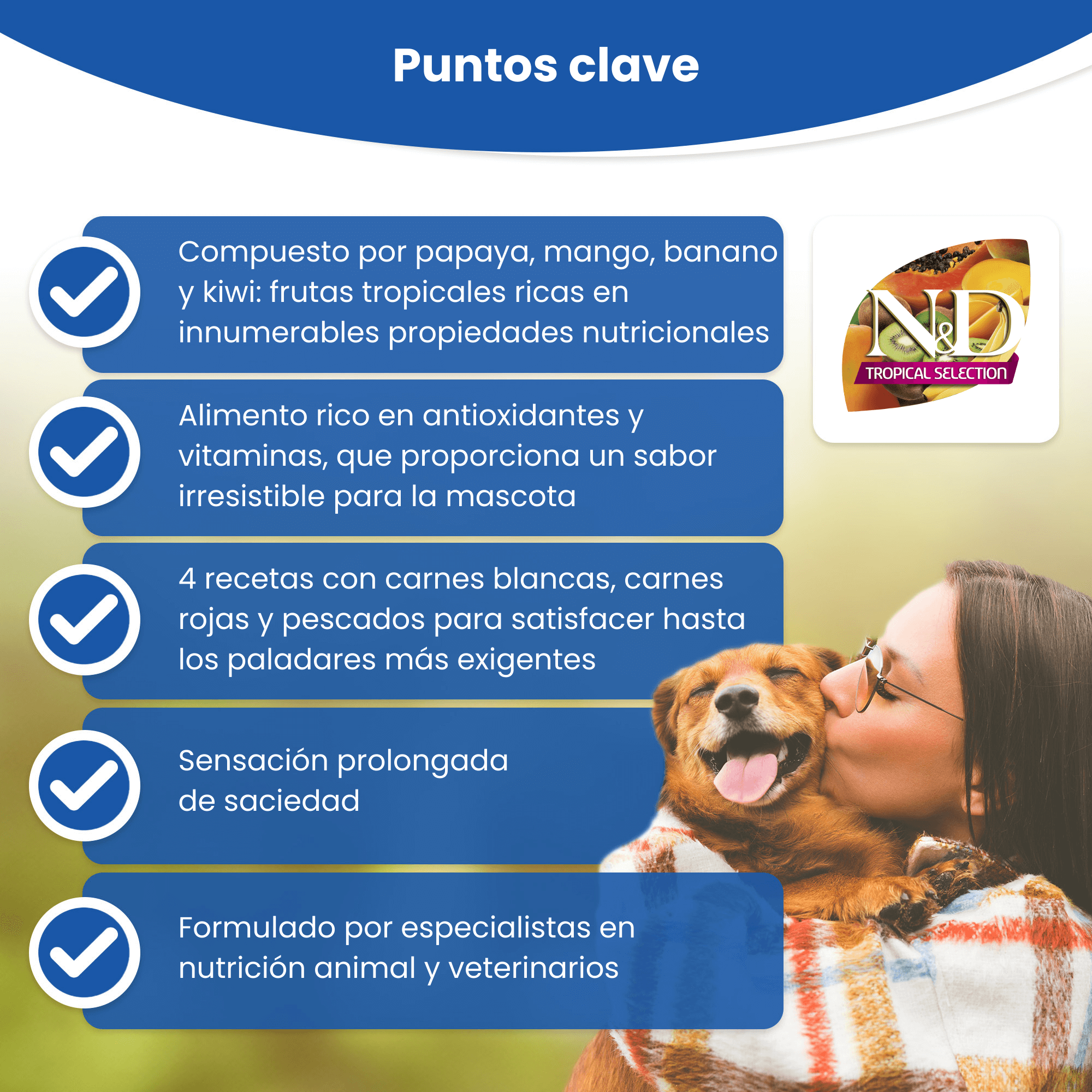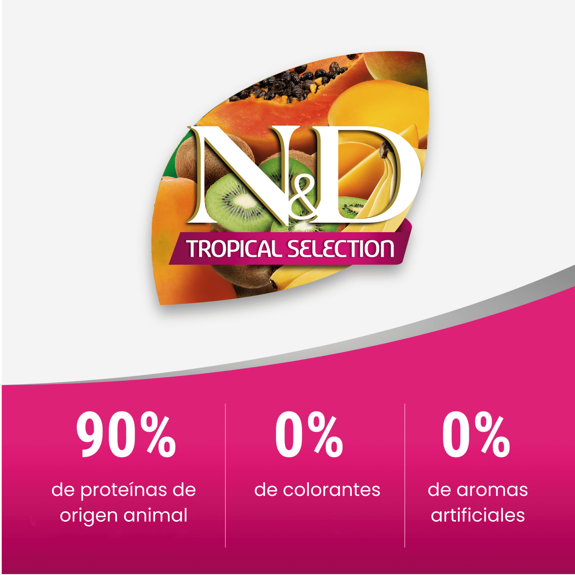 N&D Tropical Selection Adult Mini Breed es un alimento seco completo para perros adultos de raza pequeña. Formulado con carne de salmón mecánicamente separada y harina de vísceras de pollo (mínimo 20%), proporciona 90% de proteína animal de alta calidad biológica. Su fórmula especialmente diseñada para razas pequeñas combina cereales integrales ancestrales de bajo índice glucémico con frutas tropicales seleccionadas que aportan vitaminas y antioxidantes naturales. Enriquecido con glucosamina, condroitina, omega-3 y omega-6 que favorecen pelaje brillante, articulaciones saludables y función cognitiva óptima.