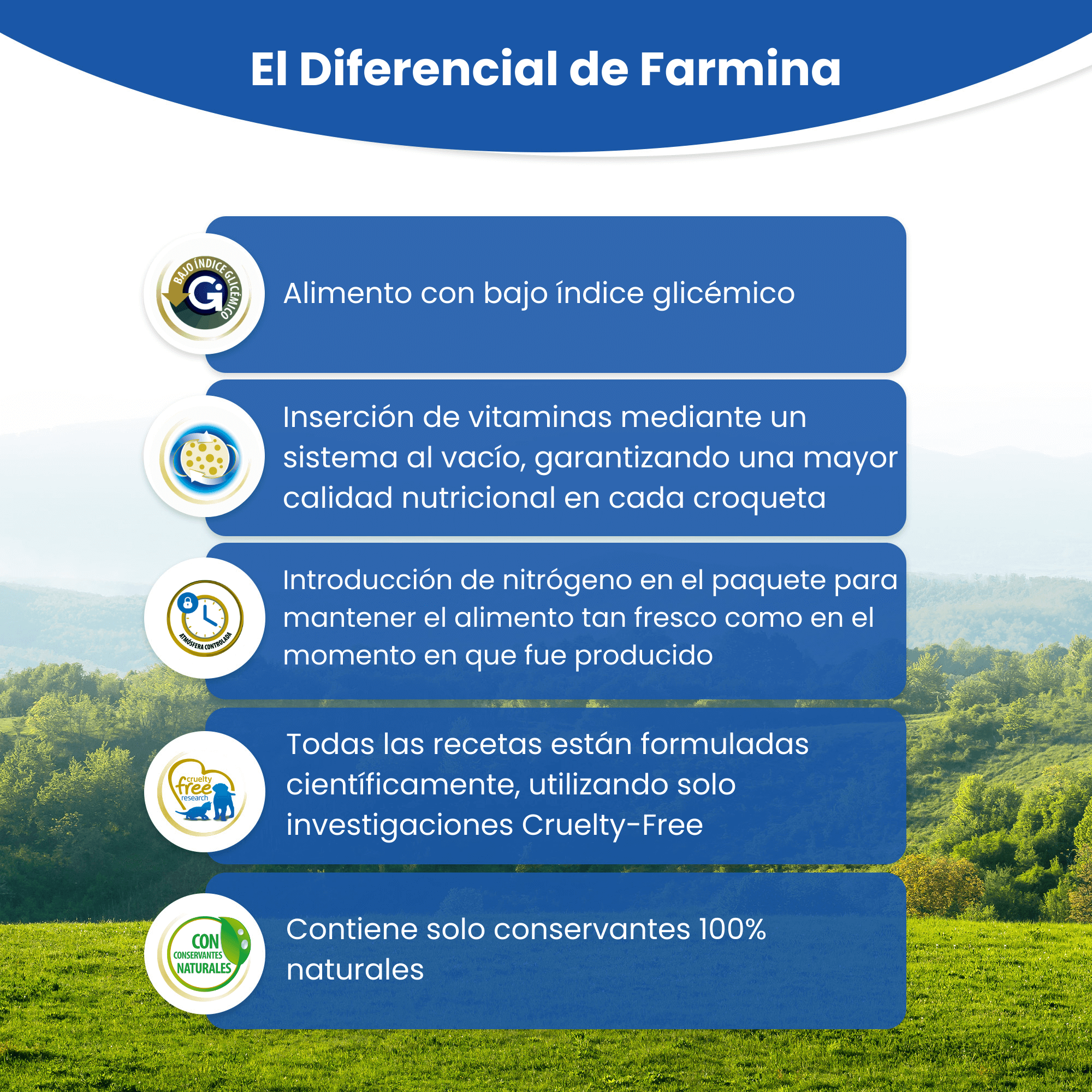 Ideal para perros adultos de raza pequeña que necesitan una nutrición balanceada premium con atención especial a la salud articular. Formulado sin cereales refinados, sin ingredientes transgénicos, sin colorantes ni conservantes artificiales, conservado únicamente con ingredientes naturales. Fabricado por Farmina Pet Foods en Italia, proporciona nutrición completa que favorece digestión óptima, fortalece defensas, mantiene musculatura tónica y promueve vitalidad en razas pequeñas.