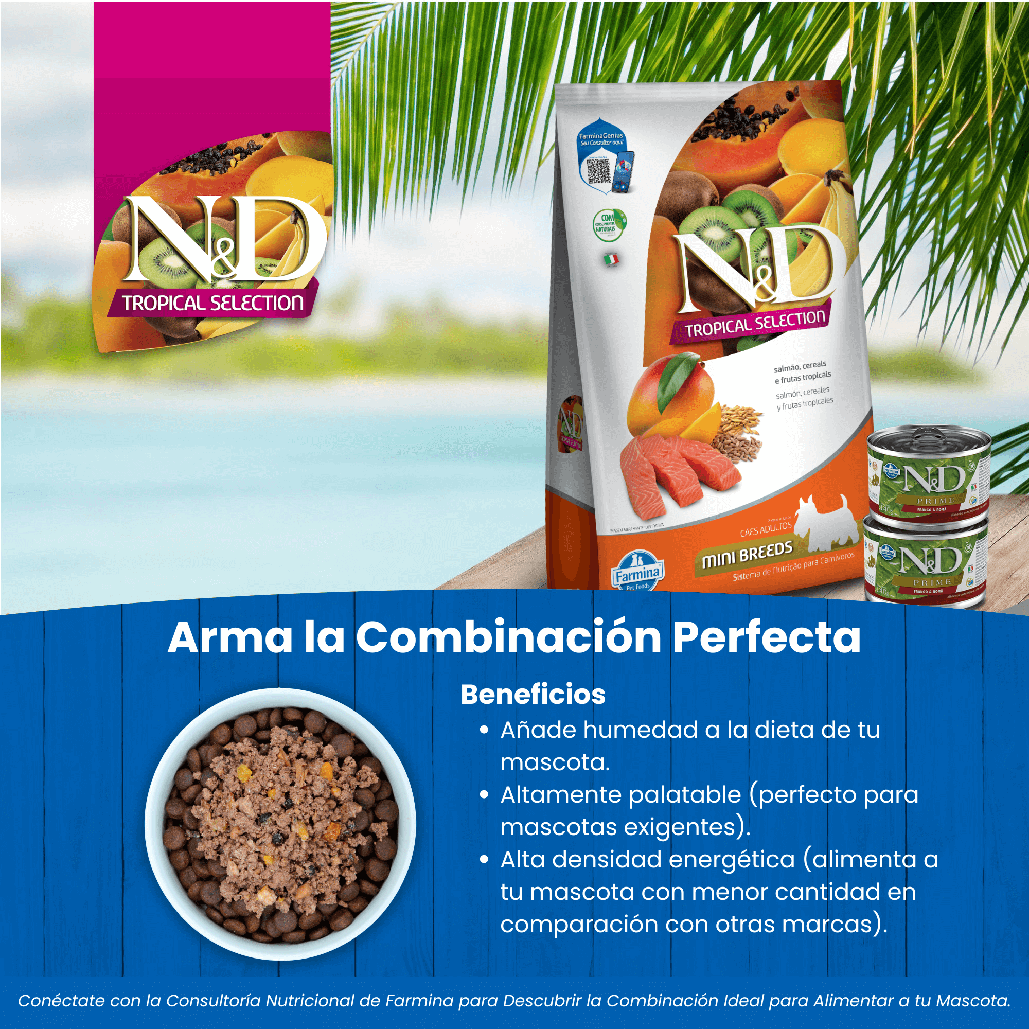 N&D Tropical Selection Adult Mini Breed, Alimento Seco para Perros Adultos, Raza Pequeña, Salmón, Cereales y Frutas Tropicales, bolsa de 2.5 kg