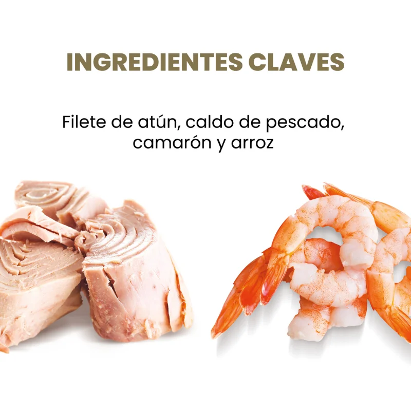 - 55% Filete de Atún, 20% Gambas (o camarón), 24% Caldito de Pollo, 1% Arroz