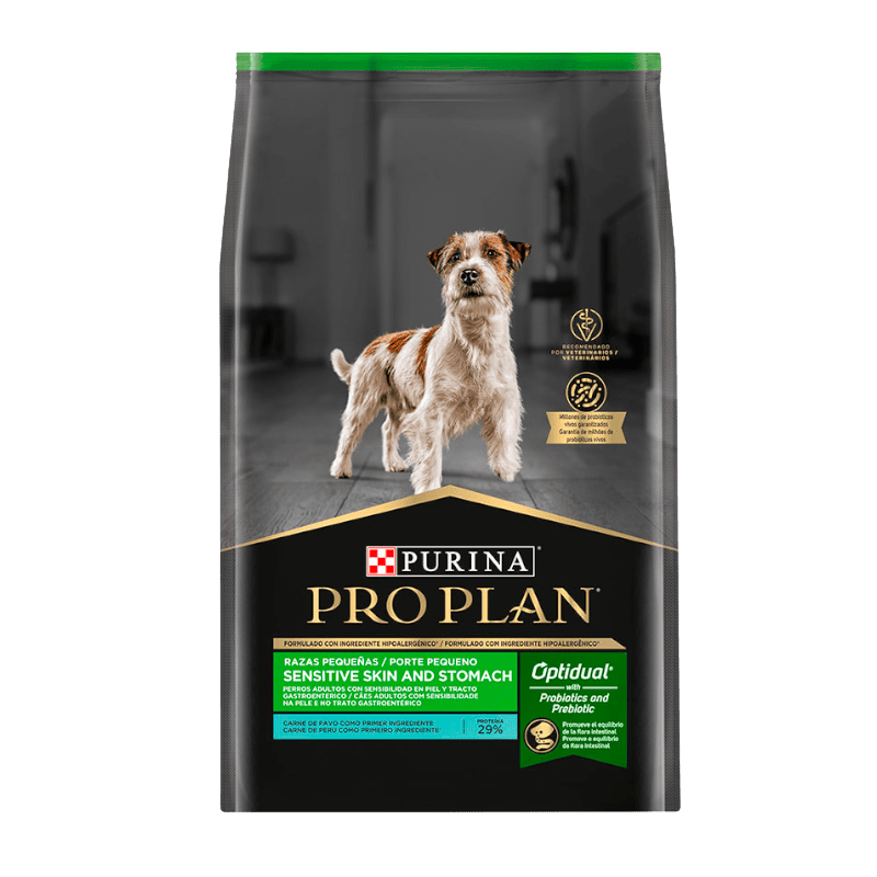 PRO PLAN® Sensitive Skin and Stomach Razas Pequeñas ha sido formulado específicamente para brindar una nutrición completa y balanceada a perros adultos de razas pequeñas que presentan sensibilidad digestiva o problemas dermatológicos. Su fórmula utiliza carne de pavo como primer ingrediente, una proteína alternativa ideal para perros que nunca han sido expuestos a ella, disminuyendo el riesgo de reacciones adversas.
