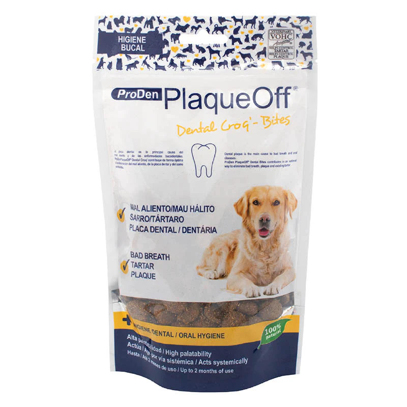 Suplemento Alimenticio 100% natural contra la placa, el sarro y el mal aliento. COMPOSICIÓN ÚNICA: Alga Ascophyllum nodosum* D1070, granos de cereales y sus productos derivados, aceite de oliva, antioxidante natural: aceite esencial de romero, levadura (fuente de vitamina B) Sin conservantes, ni aditivos, sin colorantes añadidos. Proteína 7%, Contenido en grasa 5,5%, Fibra bruta 2%, Cenizas brutas 7%. DOSIS: Presentación 150g: Perros medianos de 10 – 25 kg de peso: 2-4 croquetas/día Perros grandes a partir de 25 kg de peso: 4-5 croquetas/día Cada croqueta aporta 3,3 Kcal. Se recomienda que el animal tenga siempre disponible agua fresca.