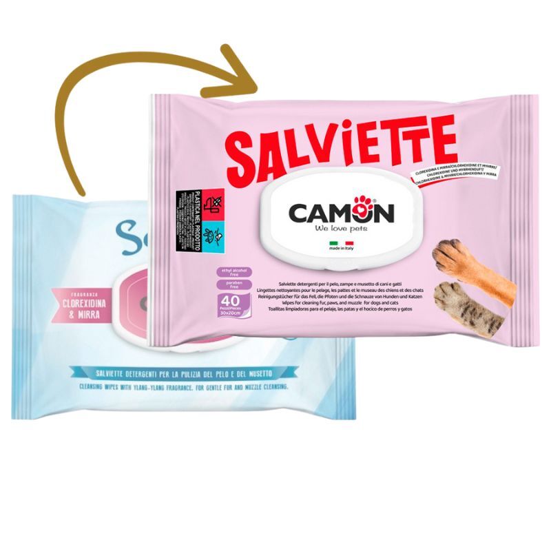 Camon Salviette, Toallitas Húmedas con Clorhexidina y Mirra para Perros y Gatos, 40 Unidades