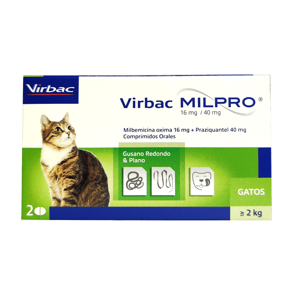 MILPRO® está indicado para el tratamiento de infestaciones combinadas de cestodos inmaduros y adultos (taenias) y nematodos (gusanos redondos) de las especies Dipylidium caninum, Taenia spp, Echinococcus multilocularis, Ancylostoma tubaeforme y Toxocara cati. El producto también puede ser usado en la prevención de gusano del corazón (Dilofilaria immitis) si el tratamiento concomitante contra cestodos también está indicado. En casos en que se requiera prevención contra el gusano del corazón y al mismo tiempo tratamiento contra taenias, MILPRO® puede reemplazar el tratamiento monovalente para la prevención de gusano del corazón. Composición Cada comprimido contiene