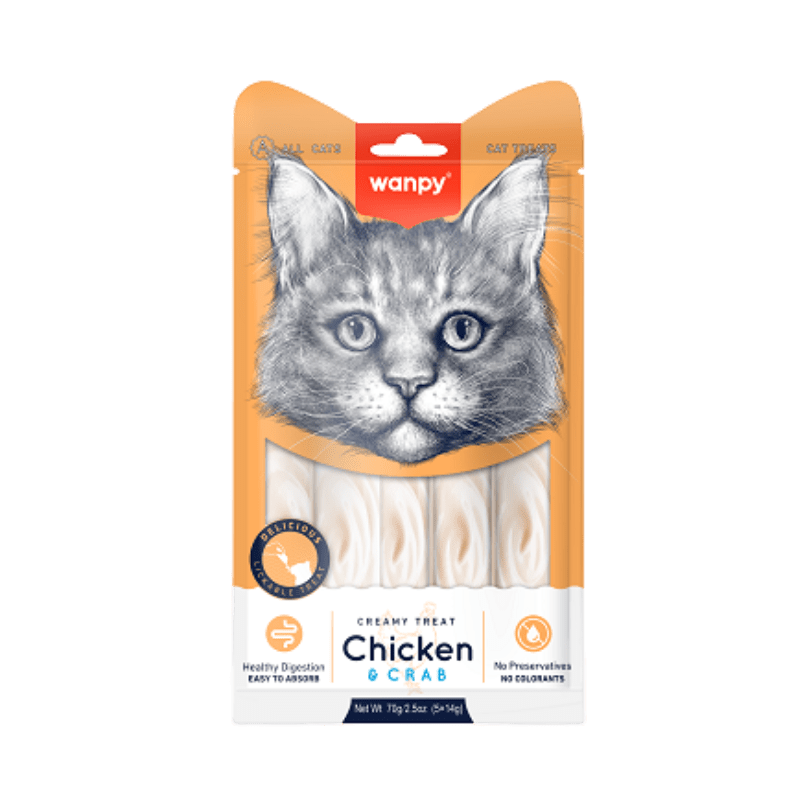 El Wanpy Creamy Treat de Pollo y Cangrejo es un delicioso snack en formato cremoso, especialmente formulado para gatos mayores de 3 meses. Está elaborado con ingredientes de alta calidad como pechuga de pollo real y carne de cangrejo, ofreciendo un sabor irresistible y una textura suave que encanta a los felinos.