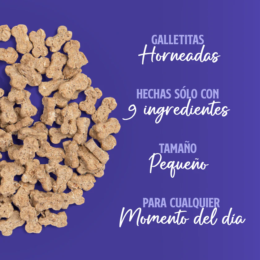 - Snack horneado natural en tamaño mini diseñado especialmente para perros de razas pequeñas (desde 3 meses de vida).